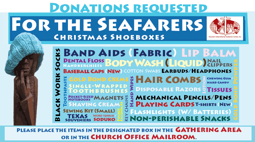 Annually, the Seafarer’s Center delivers 8,000 – 11,000 boxes filled with toiletry items, hand knit caps, treats and small gifts to over 400 ships of hardworking seafarers visiting the Port of Houston. These seafarers spend months away from home and family. They are grateful for these gifts of shared, useful items, hand packed by all of you with kindness, gratitude and holiday spirit.